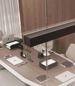 Szklane drzwi przesuwne zapewniają doświetlenie pomieszczeń i wizualne połączenie różnych stref biurowych. Dodatkowo, szkło nadaje wnętrzu lekkości i elegancji.