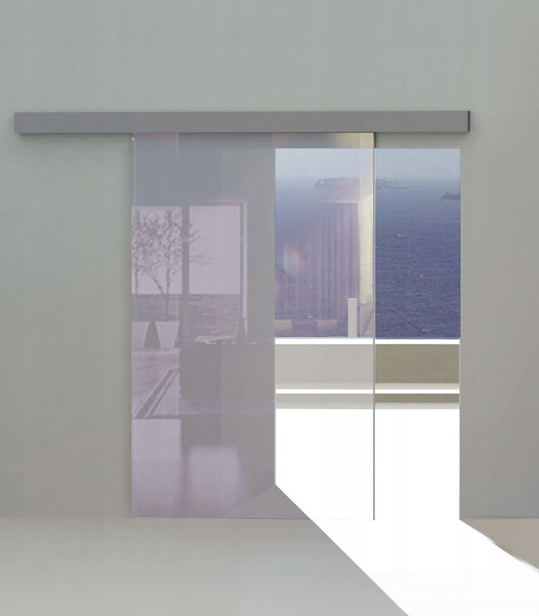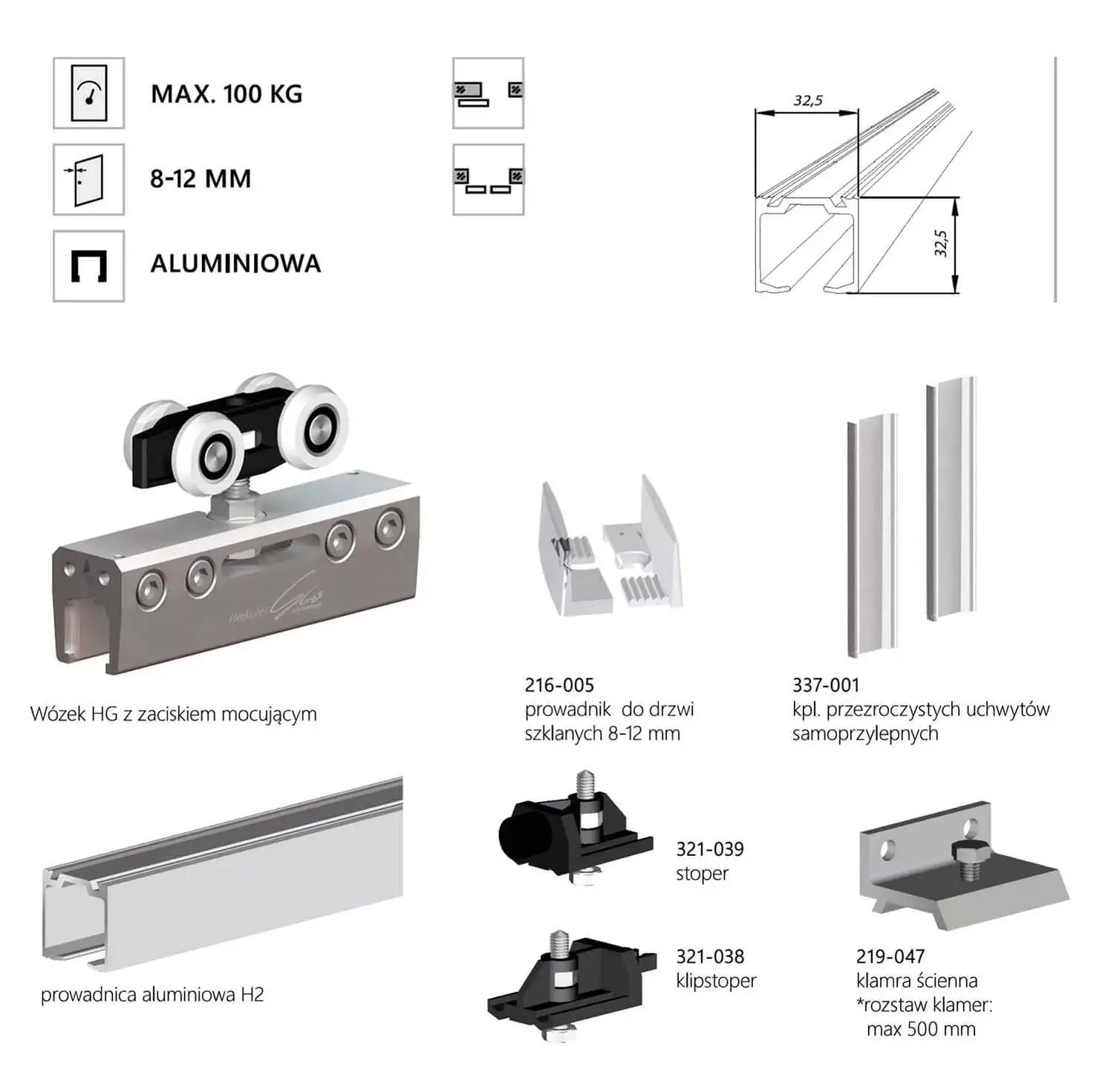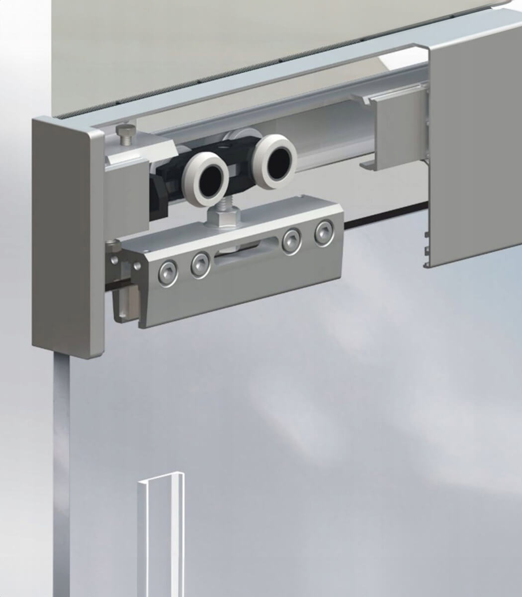 System do szklanych drzwi przesuwnych, łatwy montaż bez konieczności otworowania szkła za pomocą jednoczęściowych zacisków mocujących, możliwość zastosowania szkła, lustra, pleksi laminatów.