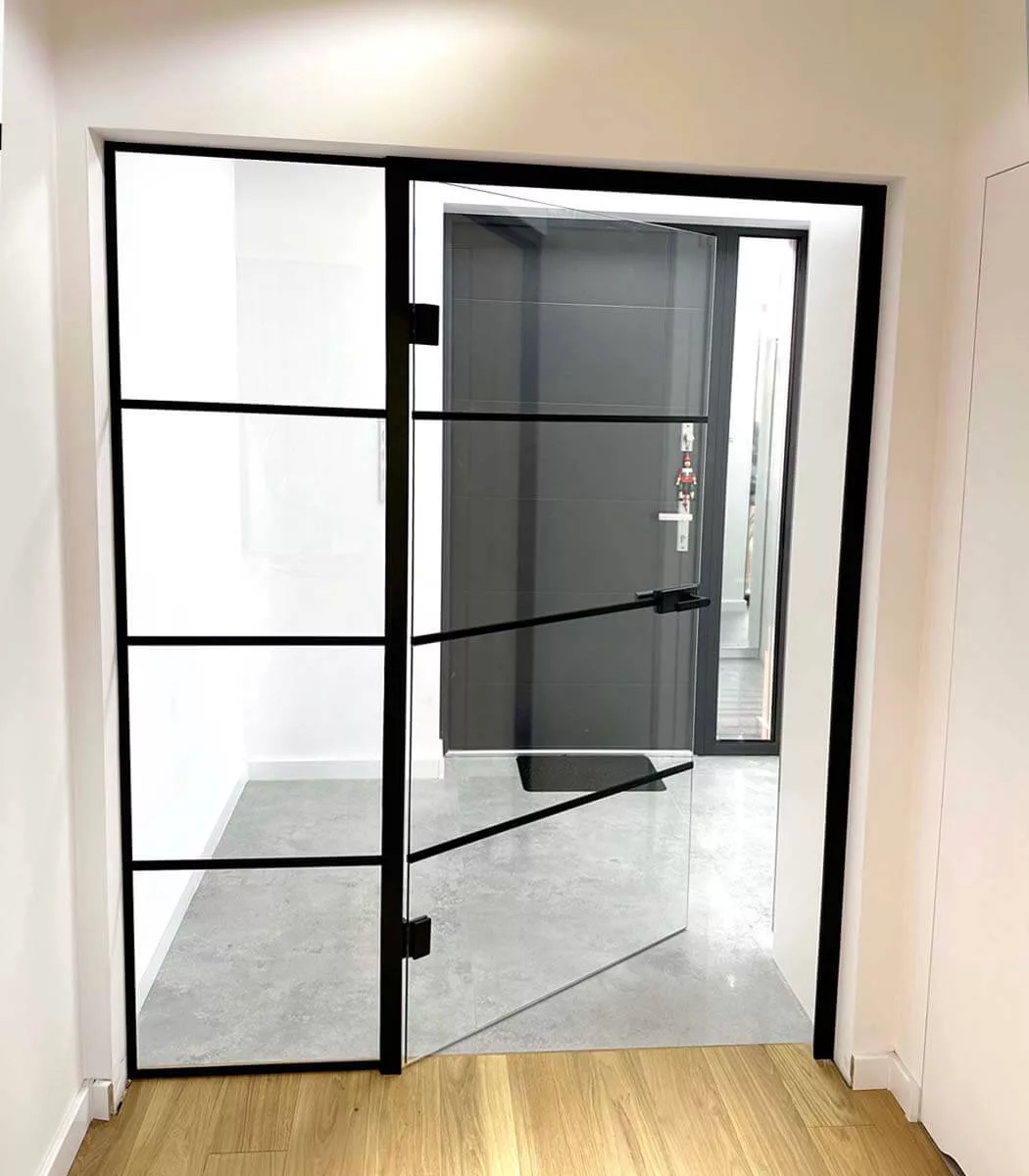 Drzwi szklane ościeżnicowe typu LOFT ze ścianką stałą. Ościeżnica pozwala na założenie zawiasów z dowolnej strony – nie ma potrzeby wybierania strony drzwi LEWE/PRAWE. Uszczelka szczelnie dolega z każdej ze stron. Łatwy montaż zawiasów w ościeżnicy.